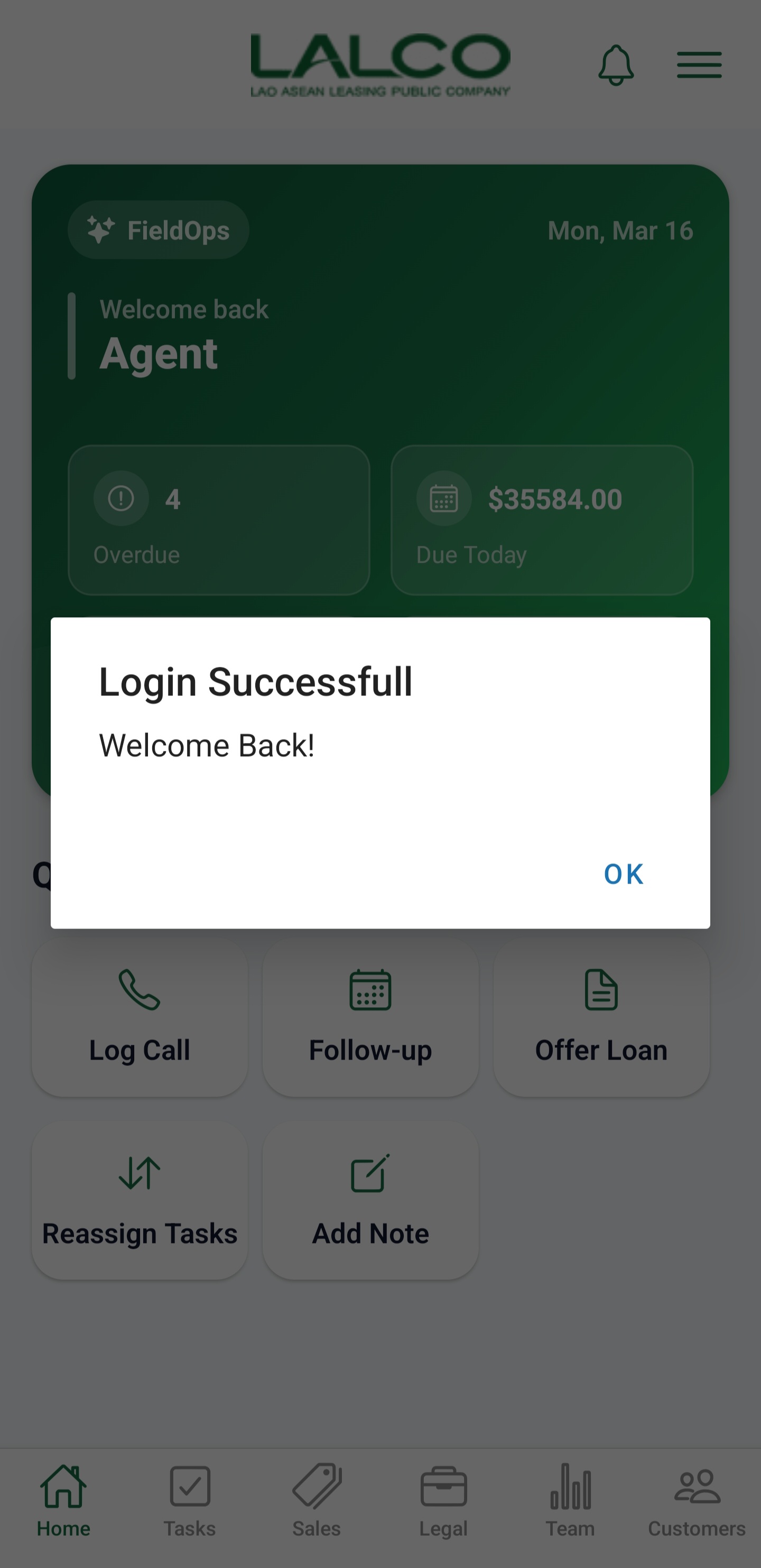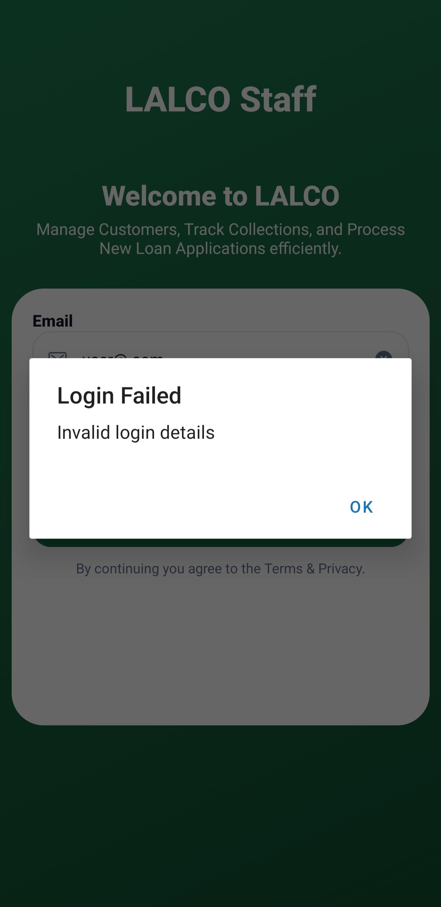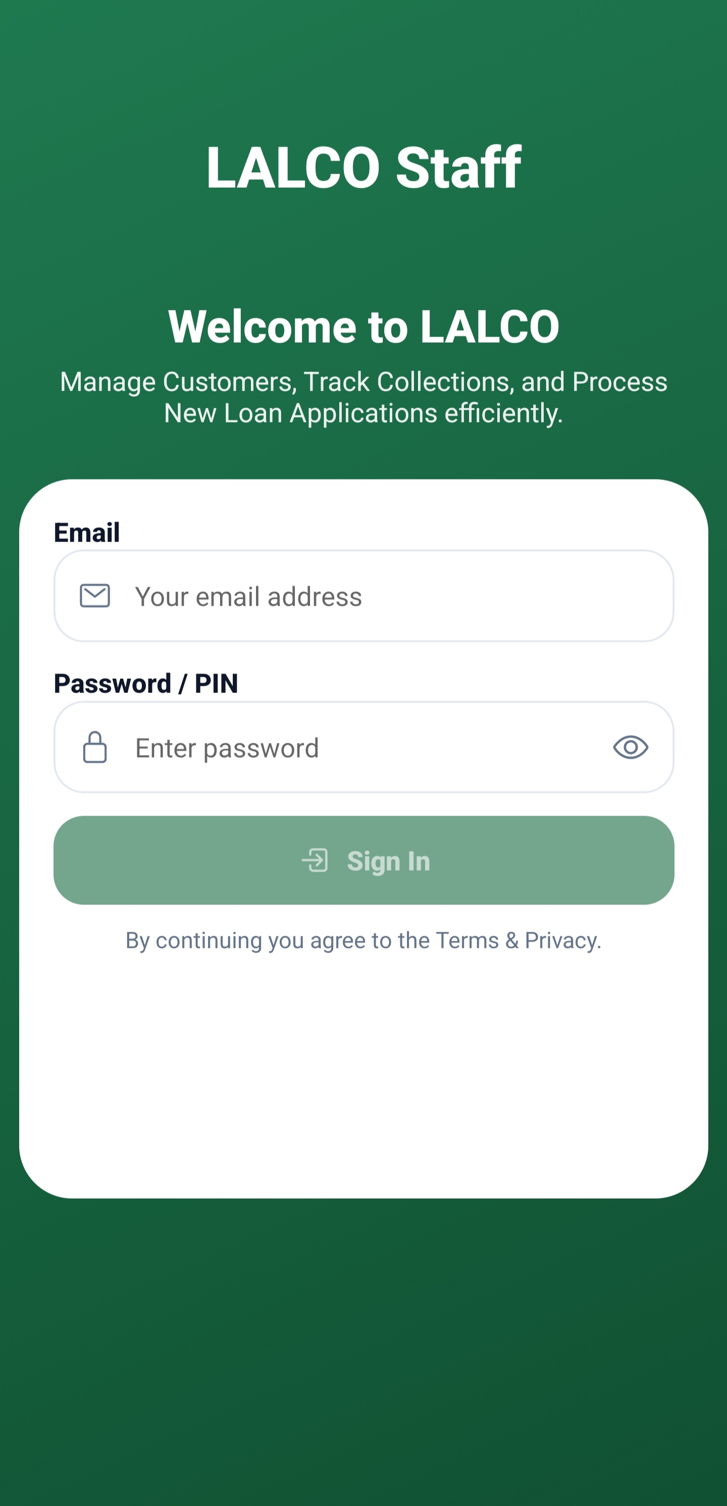The Login Screen allows authorized staff members to access the LALCO Staff application. From here, employees can log in to manage customers, track collections, and process loan applications.