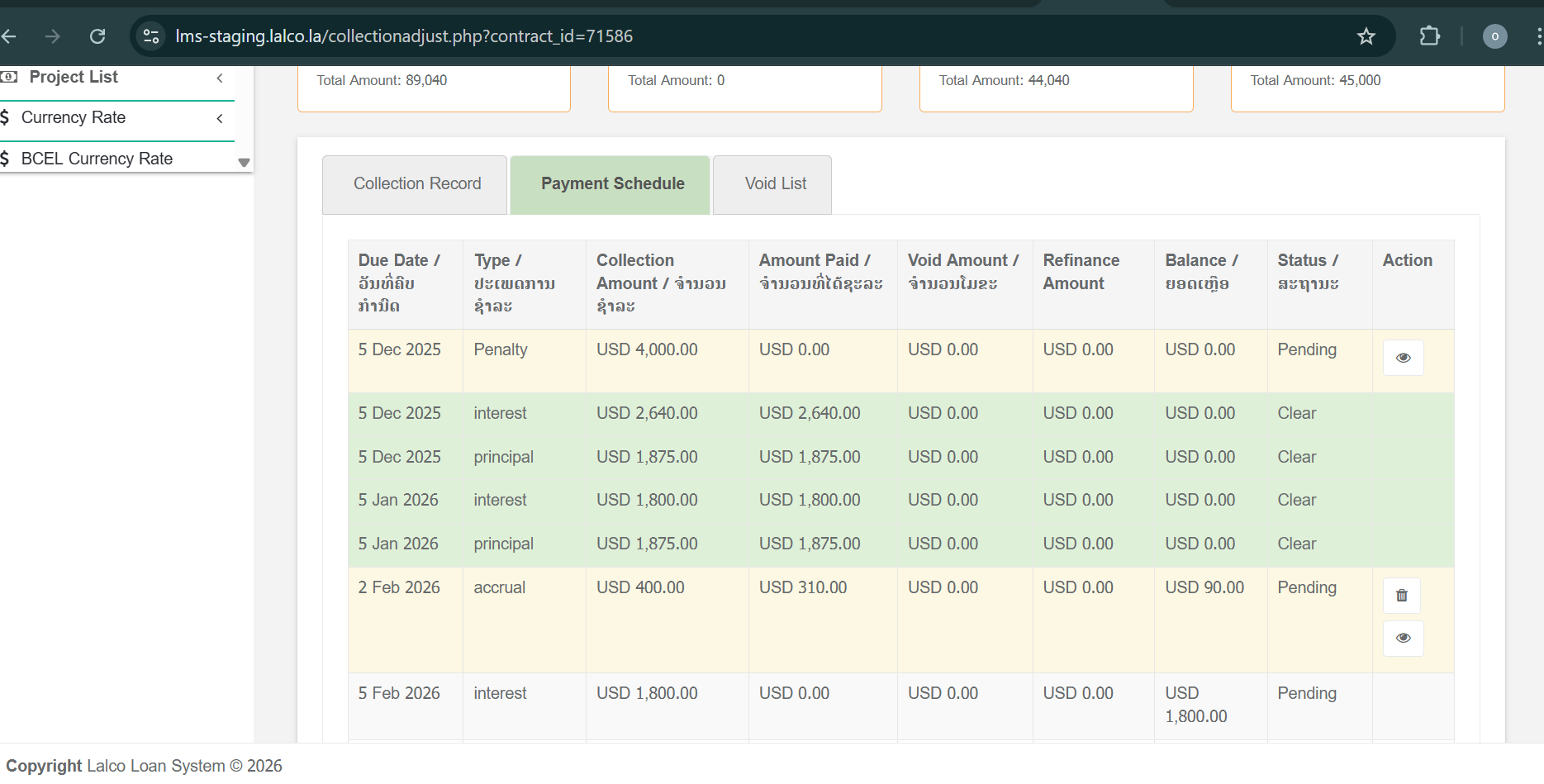 Each record shows details of collections already made against the contract.