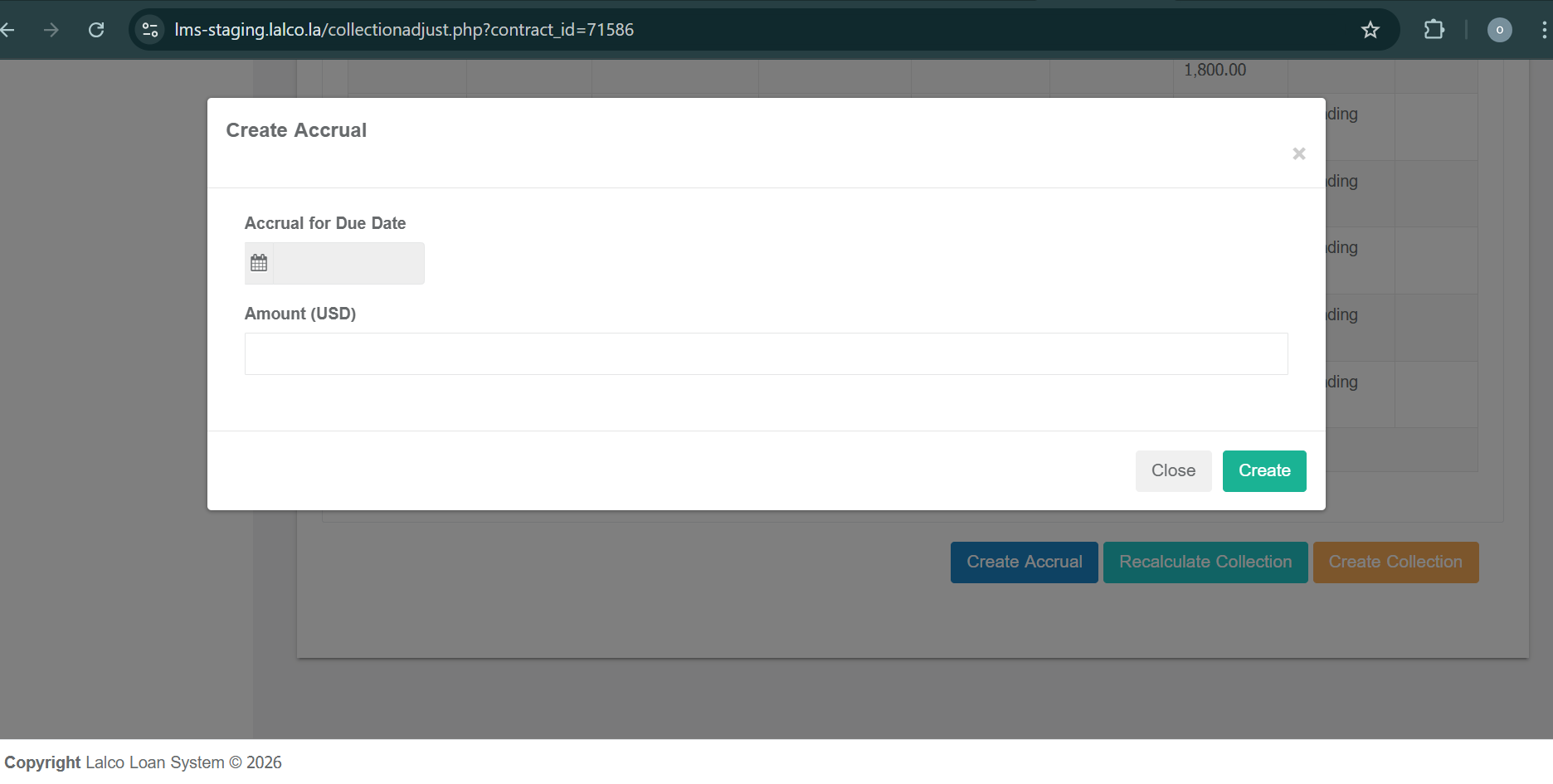 Clicking Create Accrual opens a popup window.